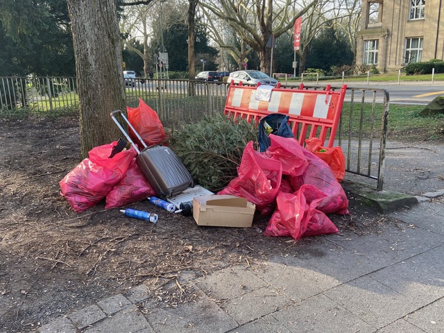 Abfallsäcke, Zangen und Handschuhe stehen dort bereit.